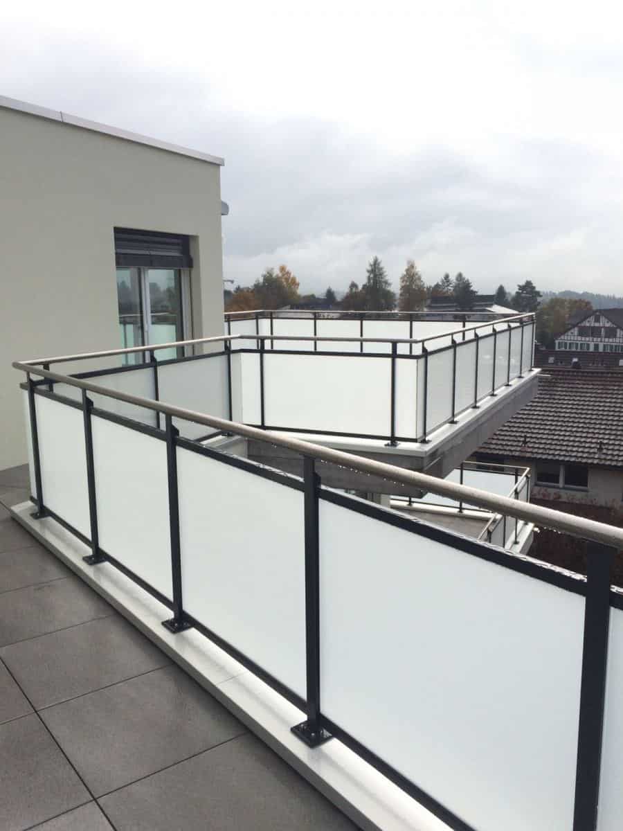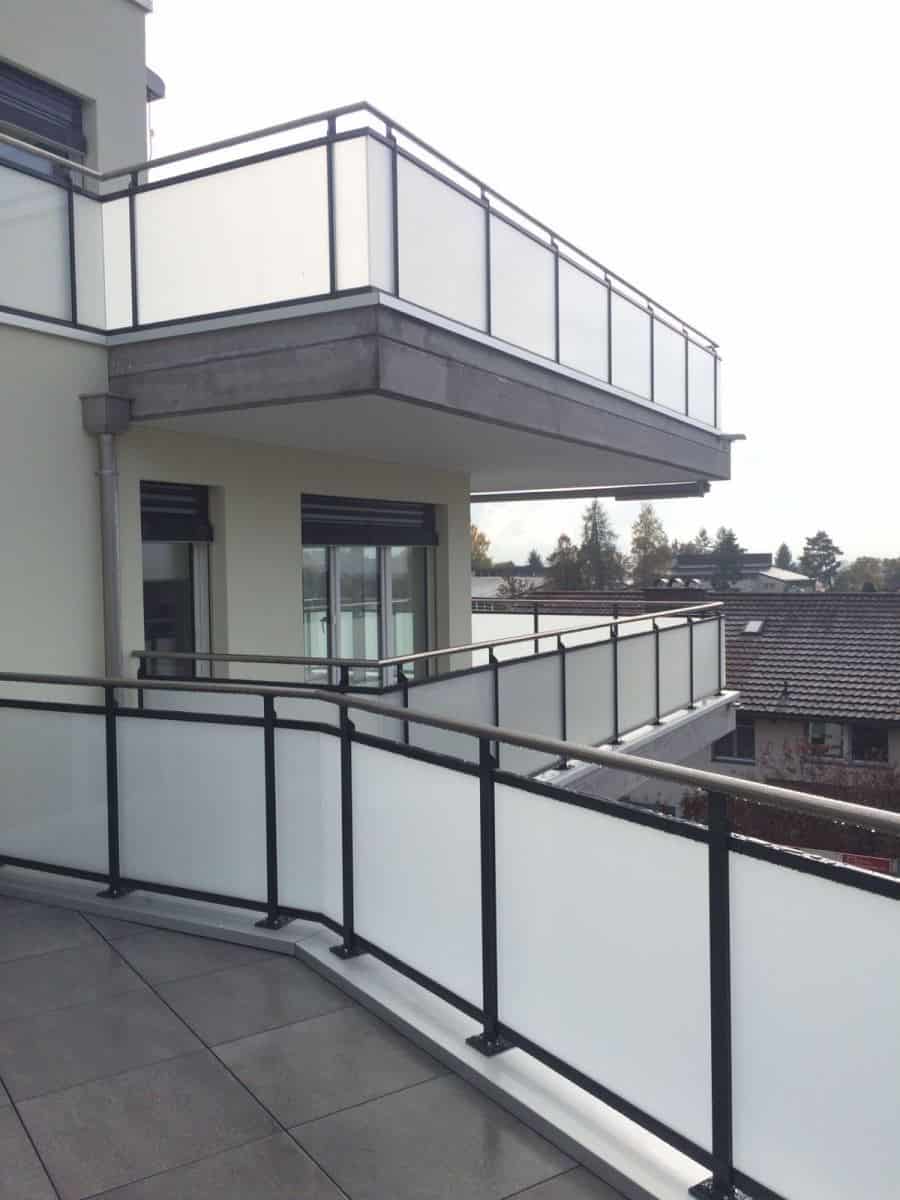 Balkongeländer aus Stahl mit Glasfüllung VSG Weissglas mit Mattfolie