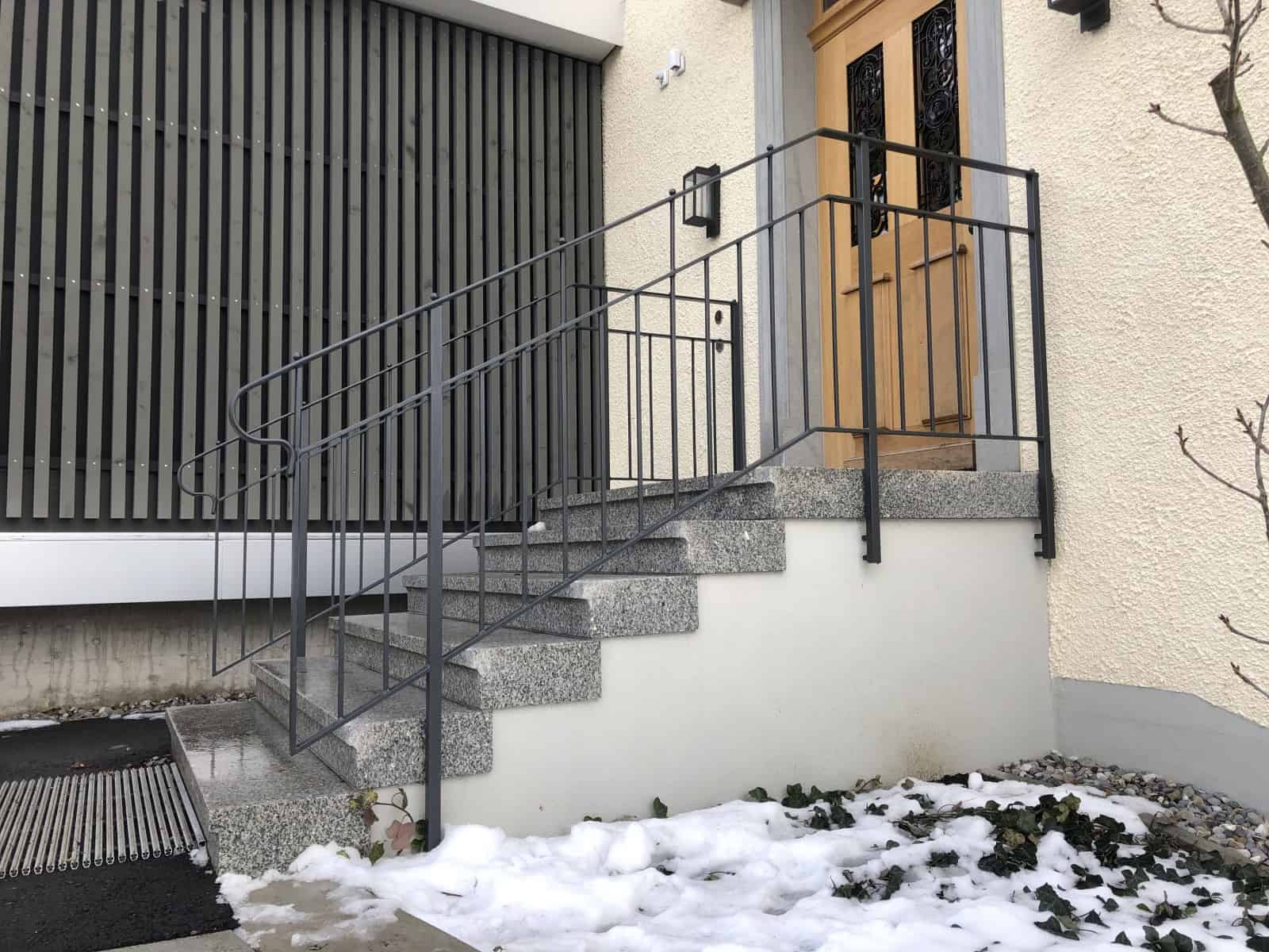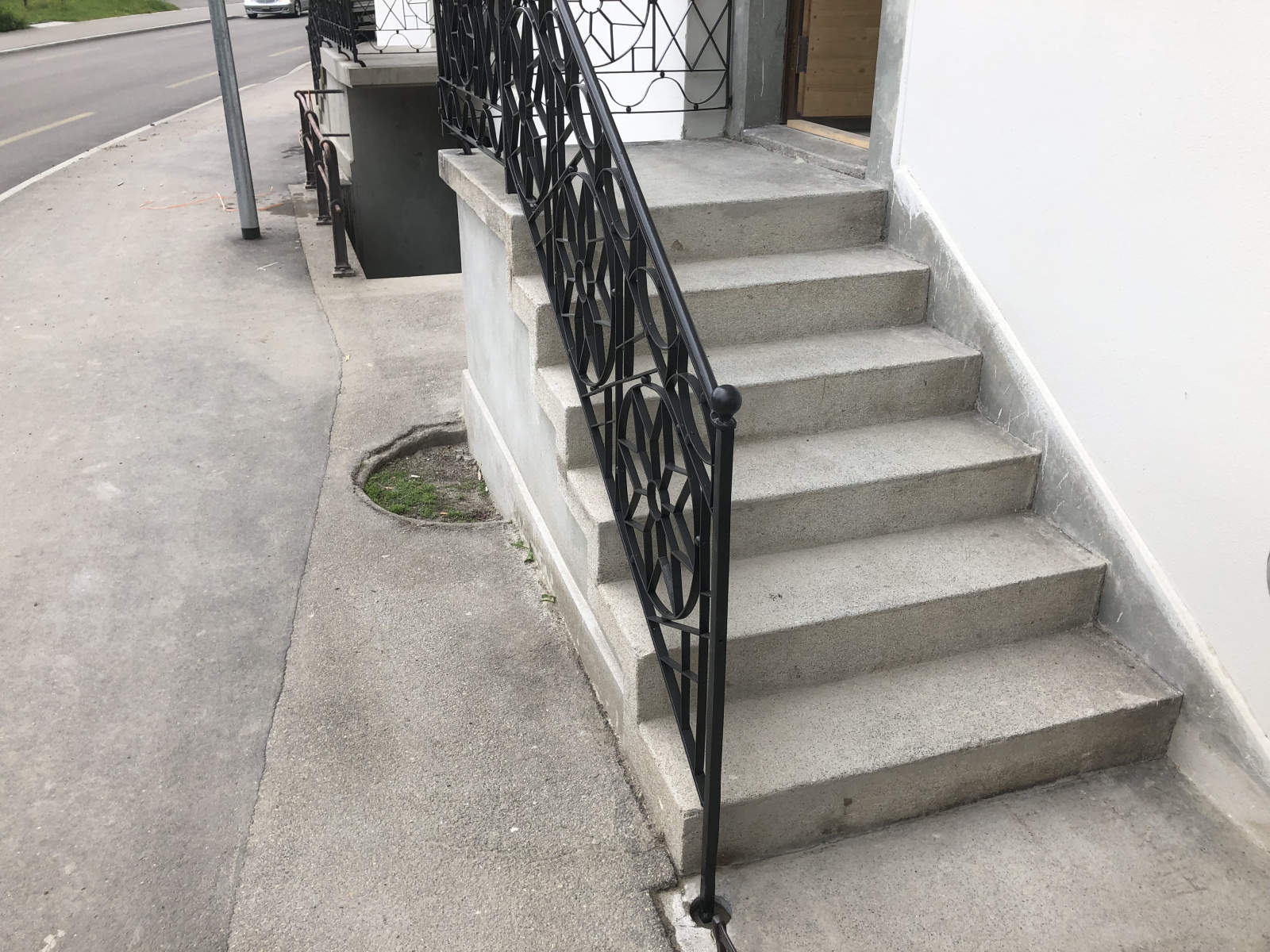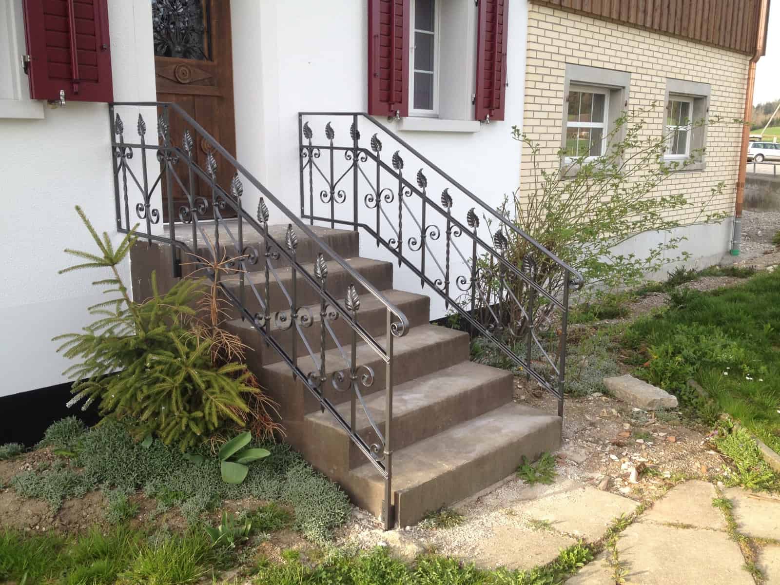 Geschmiedetes schnörkel Geländer mit einbetoniertem Pfosten vor dem Hauseingang