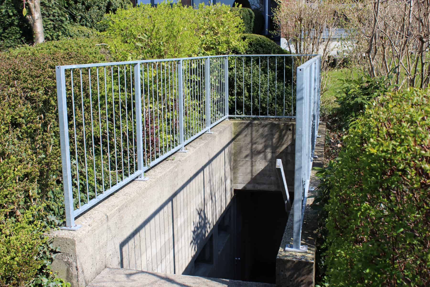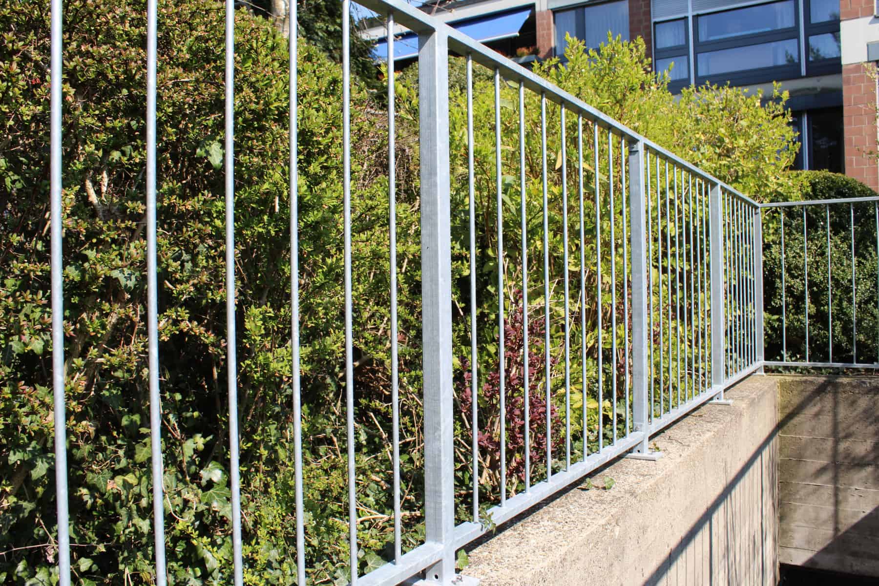 Standard Staketengeländer mit Rahmen aus Rechteckrohr mit Staketen aus Rundeisen und Pfosten aus Vierkantrohr